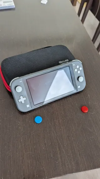 Console Nintendo Switch Lite in colore grigio. Include custodia protettiva e due coperchi per i joystick (uno blu e uno rosso). - Custodia da trasporto nera con interno rosso. - Coperchi per joystick colorati.