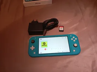Console portatile Nintendo Switch Lite in colore blu/verde. Include custodia protettiva, caricabatterie e due carte di gioco. Funziona bene e senza problemi. Prezzo non negoziabile. - Custodia di trasporto rigida. - Adattatore di corrente. - Due carte di gioco, FIFA 19 e 20