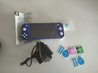 Console Nintendo Switch Lite in colore blu. Include caricatore e accessori. - Caricatore di corrente. - Protezioni per lo schermo. - Coperchi per joystick. - Custodia aggiuntiva con scomparti - Collezione di giochi 30 in 1