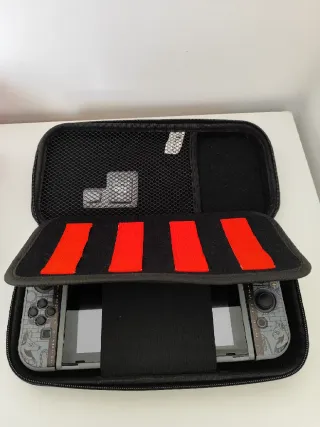 Custodia rigida portatile per la Nintendo Switch. Sono presenti due laccetti joycon, due custodie per i giochi (8 in totale) e due custodie per le micro sd di memoria. La custodia presenta qualche piccola imperfezione, ma all'interno è come nuova. Custodia ufficiale.