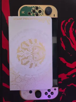 Console Nintendo Switch OLED edizione speciale The Legend of Zelda: Tears of the Kingdom. MOLTI EXTRA - Design ispirato al gioco. - Finitura dorata e bianca. - Include Joy-Con con dettagli unici. - Include custodia da trasporto. - Include micro SD da 128 GB