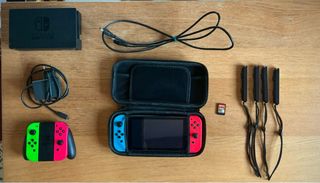 Console Nintendo Switch con accessori. Include custodia di trasporto, dock per caricare e collegare alla TV, caricatore, Joy-Con (sinistro e destro), manette per Joy-Con, due manette aggiuntive blu, nove giochi e scheda micro SD da 256 GB.