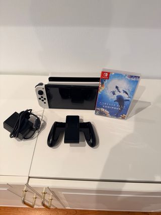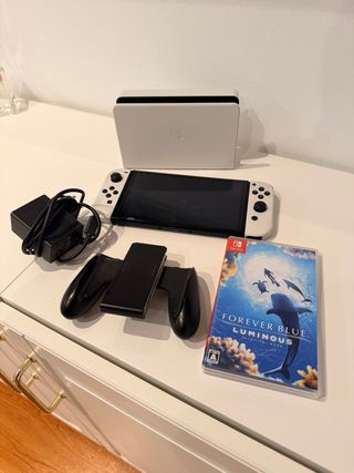 Console Nintendo Switch modello OLED in colore bianco. - Schermo OLED da 7 pollici. - Base di ricarica. - Controller Joy-Con. - Gioco Forever Blue. - Micro SD 256GB.