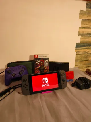 Consola Nintendo Switch in grigio con accessori e un gioco. In ottime condizioni con lievi segni d'uso. Perfetta come regalo e pronta all'uso. Regalo scheda micro SD. Altri prodotti e giochi nel mio profilo. Effettuo spedizioni. - Include console Nintendo Switch. - Controller aggiuntivo color viola. - Gioco WWE 2K18. - Caricabatterie e cavi. - Custodia da trasporto.