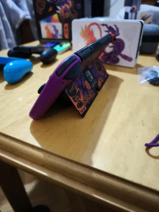 Console Nintendo Switch con accessori. Include console, Joy-Cons e base. Custodia protettiva per il viaggio nera. Carcasa e grips di colori rosa e viola. Acquistata meno di un anno fa, poco utilizzo. Schermo con protezione. Molto curata. Con micro sd per aumentare la capacità.