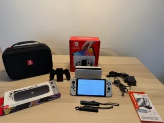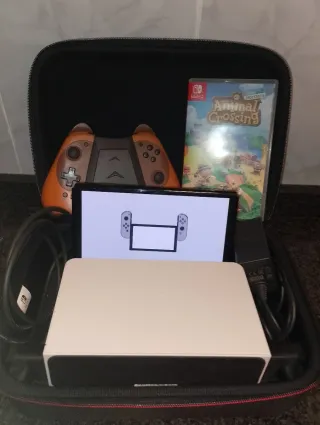 Console Nintendo Switch OLED con accessori. - Controller wireless. - Base di ricarica. - Batteria esterna Enerjoy Pro. - Dock per la console. - Custodia per il trasporto della console.