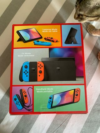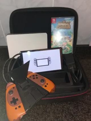 Console Nintendo Switch OLED con Joy-Cons in blu e rosso, insieme alla sua custodia protettiva. Molto curata, in perfetto stato, utilizzata 4 volte con tutti gli accessori, scatola, ecc. - Schermo OLED. - Include custodia da trasporto. - Cavo di ricarica. - Base di gioco. - Fascette per il controller.
