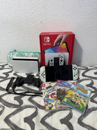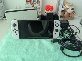 Console Nintendo Switch modello OLED in bianco. Include tutti gli accessori originali. Quasi nuova, usata pochissimo. - Schermo OLED. - Joy-Con bianchi. - Base di ricarica. - Caricatore. - Cinturino per Joy-Con. - Scheda microSD da 128Gb. - Gioco Minecraft. - Gioco Fc24. - 4 cristalli di ricambio. - Custodia per conservare e trasportare. - Cover trasparente.