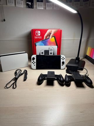 Console Nintendo Switch modello OLED in colore bianco. Con la sua scatola originale - Schermo OLED vibrante. - Archiviazione interna da 64 GB. - Supporto ampio e regolabile. - Scheda di memoria SD da 256 GB. - Tre controller con adattatore, due originali. - Caricatore multiplo per 2 controller. - Custodia per riporre e trasportare.