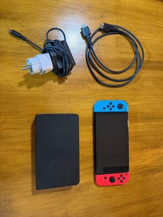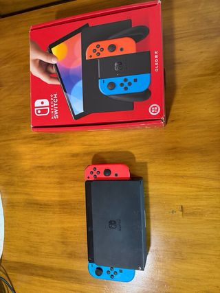 Console Nintendo Switch OLED nei colori blu e rosso. Include accessori per l'uso. Si vende per poco utilizzo, come nuova. Include: Base di ricarica, Cavo HDMI, Adattatore di corrente.