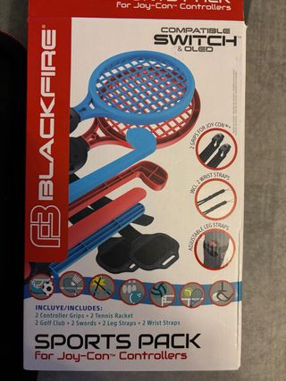 Pacchetto di accessori Blackfire per Nintendo Switch e Switch OLED. Include vari accessori per godere dei giochi sportivi. - 2 impugnature per controller Joy-Con. - 2 fasce da polso. - 2 fasce per gambe regolabili. - 2 racchette da tennis. - 2 spade. - 2 mazze da golf.