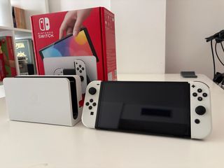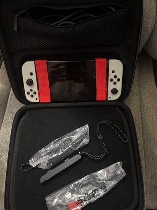 Console Nintendo Switch Oled con i suoi controller Joy-Con e custodia da trasporto. Da quando l'ho acquistata, ha una protezione in vetro temperato sullo schermo. Non è mai caduta, non ha nemmeno un graffio, è impeccabile. L'ho usata molto poco, ho giocato a 5 giochi che non ho nemmeno finito, è stata praticamente in esposizione nella mia stanza.