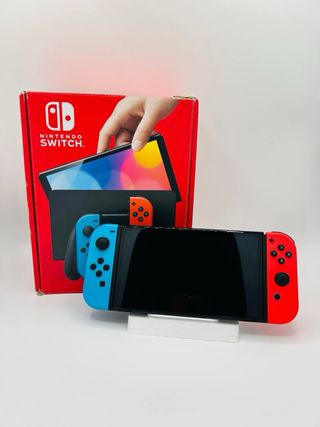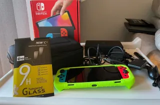 Console Nintendo Switch modello OLED. Fornita con 1 controller aggiuntivo, custodia per il trasporto, cover in silicone, 2 proteggi-schermo oltre a quello già montato e scatola originale con tutti gli accessori. Utilizzo molto limitato. - Colore blu e rosso dei Joy-Con. - Schermo OLED. - Include base di ricarica.