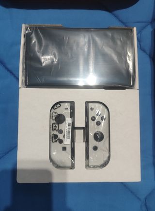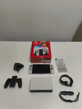 Consola Nintendo Switch OLED con tutti gli accessori originali. Include: - La console - 2 Joy-Cons bianchi - Dock per carica e connessione alla TV. - Caricatore e cavi. - 2 fasce per i Joy-Cons - 1 Joy-Con Pro Charging Grip Come opzione extra è possibile aggiungere il manico Pro mostrato nella foto per 49€ in più.