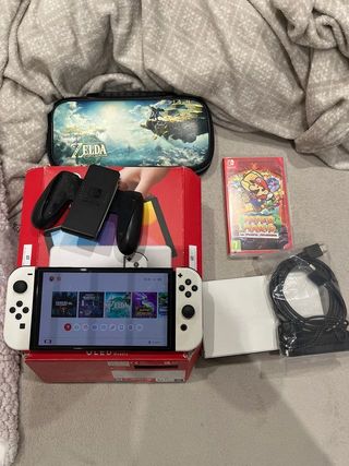 Consola Nintendo Switch OLED in bianco, senza segni o danni, con accessori e giochi. Molto curata e poco usata, la vendo perché ora ho la Switch 2. - Cover UFFICIALE di Zelda. - Gioco Paper Mario e la Porta del Millennio. - Joy-Con. - Cavo di ricarica. - Cavo HDMI. - Dock Edizione Bianca. - Controller per Joy-Con. - Scatola. *PREZZO NON TRATTABILE*