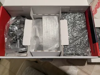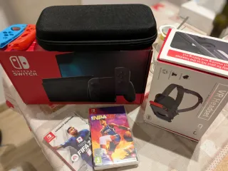 Console Nintendo Switch nella sua confezione originale, con accessori per la realtà virtuale e due videogiochi. Non presenta segni di utilizzo, è come nuova. Include due controller Joy-Con (uno blu e uno rosso), custodia di trasporto nera, occhiali VR per Nintendo Switch, videogioco FIFA 23 Legacy Edition e NBA 2K23.