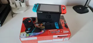 Console Nintendo Switch con joy-con blu e rossi, completa di dock e controller aggiuntivo. - Include il gioco Mario Kart 8 Deluxe. - Joy-con inclusi: 1 blu, 1 rosso. - Controller aggiuntivo nero con dettagli rossi e blu. Compreso di un telecomando aggiuntivo. Condizione come nuova senza graffi e difetti!