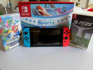 Vendo console Nintendo Switch con due giochi. - Console Nintendo Switch. - Gioco Super Mario Bros. Wonder. - Gioco EA SPORTS FC 25. - Console con joy-con blu e rossi. - Custodia