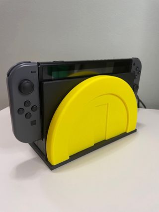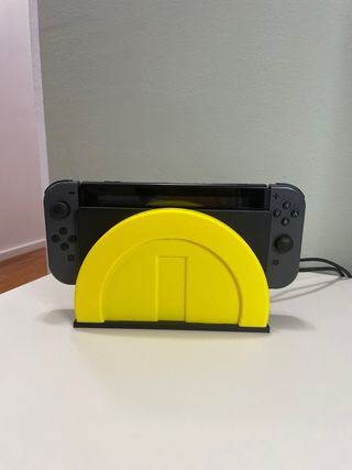Supporto a forma di moneta Super Mario per Nintendo Switch. - Design a forma di moneta gialla. - Base nera. - Ideale per esporre la console.
