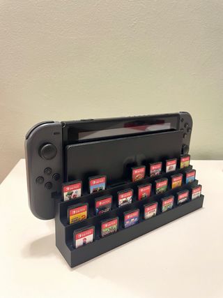 Supporto nero per cartucce di giochi per Nintendo Switch. Organizza la tua collezione in modo ordinato. - Design a più livelli. - Materiale plastico resistente.