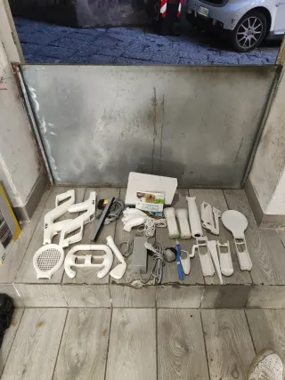 Lotto di accessori per Nintendo Wii. - Volante per giochi di guida. - Racchetta da tennis. - Mazza da golf. - Controller Wii. - Nunchuk. - Cavo di alimentazione. - Base per Wii. - Altri accessori inclusi.