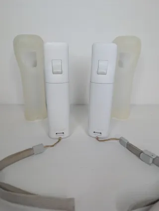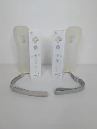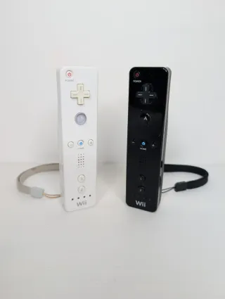 Lotto composto da due telecomandi originali Nintendo Wii nelle colorazioni bianco e nero, completi di laccetti di sicurezza. Entrambi i controller sono stati testati e risultano perfettamente funzionanti in ogni tasto e funzione di puntamento. Si segnala che lo sportellino del vano batterie del telecomando bianco non è quello originale, ma si chiude correttamente e garantisce la stabilità delle batterie durante l'uso. Esteticamente i controller presentano i normali segni di usura dovuti al tempo
