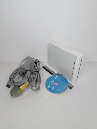 Console Nintendo Wii originale di colore bianco, modello compatibile con controller e giochi GameCube, in ottime condizioni estetiche e perfettamente funzionante. Il set è completo di tutti gli accessori necessari per giocare: alimentatore originale, cavo AV con adattatore SCART, barra sensore e un controller Wii Remote con laccetto di sicurezza. Inclusi nel pacchetto il gioco MySims Sky Heroes completo di disco, custodia e manuale di istruzioni originale. Tutti i componenti sono stati testati e risultano pronti all'uso, con contatti batteria puliti e sportellini della console integri.