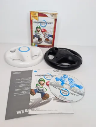 Lotto originale Nintendo Wii composto dal gioco Mario Kart Wii versione Nintendo Selects (custodia, manuale e disco) e due accessori Wii Wheel, uno bianco e uno nero. Il software è completamente in lingua italiana e testato come perfettamente funzionante nonostante il disco presenti numerosi graffi superficiali e la copertina mostri evidenti segni del tempo e usura. Anche i due volanti sono originali, testati e pronti all'uso per sessioni multiplayer fino a due giocatori.