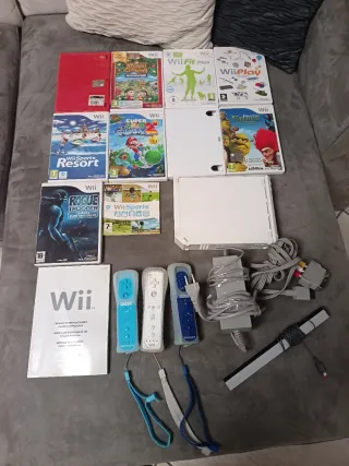 Kit completo per Nintendo Wii con console, 10 giochi e 3 protezioni per controller (controller non inclusi) . - Console Wii bianca. - Giochi inclusi: Wii Sports Resort, Super Mario Galaxy 2, Rogue Trooper, Wii Sports, Animal Crossing, Wii Fit Plus, Wii Play, Shrek. - 3 controller Wii (2 nunchuk e 1 wiimote). - Cavi e alimentatore inclusi.