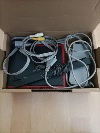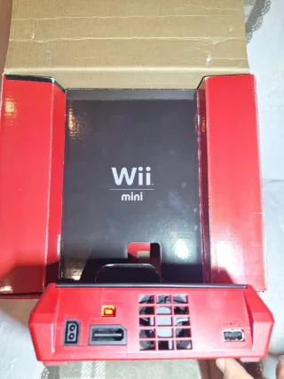 Consola Wii Mini in colore rosso e nero. Include quattro giochi, sensore e tutti i cavi nuovi, senza controller. In regalo anche adattatore per cavo HDMI e cavo HDMI.