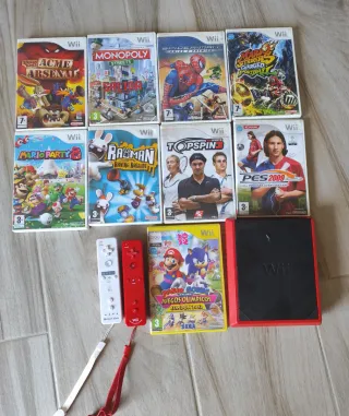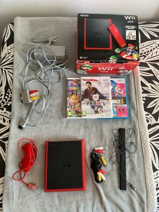 Consola Nintendo Wii Mini in colore nero e rosso. Include telecomando e cavi. In ottime condizioni, con tutti gli accessori. - Telecomando Wii Remote rosso e un altro blu, perfetto stato. - Cavi di connessione AV. - Adattatore di corrente. - Giochi inclusi: Wii Sports, FIFA 14, Just Dance 2014 e Mario Party 9.