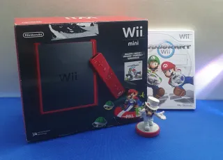 Consola Nintendo Wii Mini in colore rosso. Include 2 controller, 2 custodie in silicone, 3 nunchuck. Design compatto ed elegante. Cavi di alimentazione e connessione originali. 6 giochi, incluse figure aggiuntive Skylanders. 2 volanti Mario Wii originali.