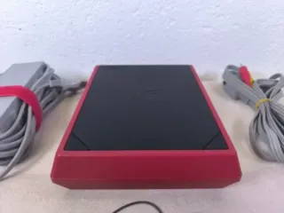 Console Nintendo Wii Mini in colore rosso. Include scatola, manuale, cavi, accessori e controller. Modello compatto e leggero. Design moderno e attraente.