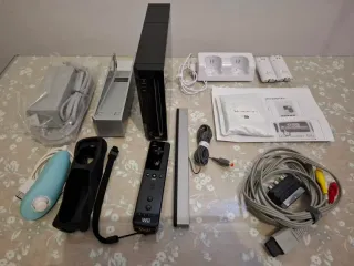 PACHETTO RARO E COMPLETO. Questa console è stata valutata da professionisti. Collezionabile pacchetto speciale. Vendo la console con tutti i suoi cavi necessari (presente anche un adattatore per un cavo) e base di appoggio, un telecomando non originale (con Wii motion plus nero e 2 protezioni in gomma nera). Un nunchuk. Gioco Wii Sports e Wii Sports Resort erano compresi nel pacco comprato. Pile non comprese nel prezzo. Un coperchio della console staccato. Scheda SD inclusa.