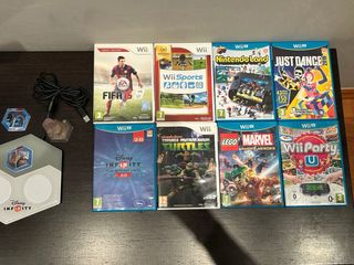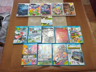 Conjunto di videogiochi per Wii U e Wii. Tutti con copertina originale e in perfette condizioni. Include titoli popolari di ogni genere. Lista dei giochi Wii U: - Mario Kart 8 - Just Dance 2014 - Super Mario 3D World - Super Mario Bros U - Splatoon - Nintendo Land - Sports Connection - Call of Duty: Black Ops II - Disney Infinity 3.0 (con piattaforma originale) - Super Smash Bros Lista dei giochi Wii: - Rogue Trooper - Wii Sport - Just Dance 2015 - Super Mario Galaxy - Mario Party 9 - Link's Crossbow Training