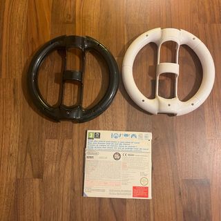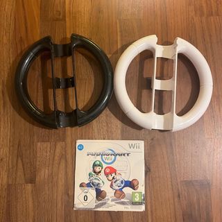 Set composto da due volanti per Nintendo Wii, uno bianco e uno nero, e la custodia del gioco Mario Kart Wii. - Volanti in plastica. - Custodia del gioco Mario Kart Wii inclusa.