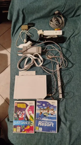Console Nintendo Wii di colore bianco, completa di: due giochi: Wii Sports Resort e Just Dance 3 - 2 joystick - Collegamento con presa scart - Cavo adattatore hdmi - Nunchuk - Sensore di movimento Sportellino laterale staccato come da foto.