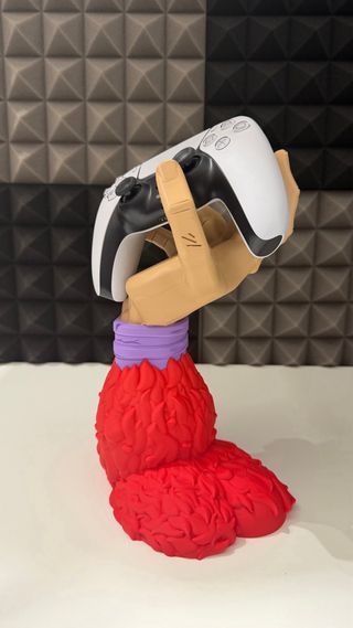 Supporto per controller da gaming, compatibile con PlayStation, Xbox e Nintendo. - Design a forma di mano. - Base colorata in rosso e arancione. - Dettagli colorati in blu e viola.
