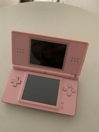 Console portatile Nintendo DS di colore rosa. - Design compatto e pieghevole. - Include un piccolo ciondolo a forma di personaggio. Senza cavo di alimentazione
