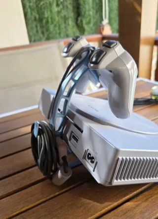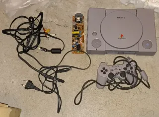 Console Playstation 1 (PS1) in colore grigio, con vari controller e cavi. Include console, cavi di connessione e alimentazione, vari controller. Tutto originale tranne il controller verde.