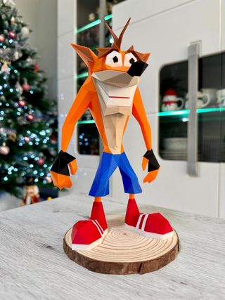 Figura decorativa del personaggio Crash Bandicoot, ispirata all'era di PlayStation 1 (PSX). Design poligonale moderno. Colori vivaci: arancione, blu e rosso. Base in legno inclusa.