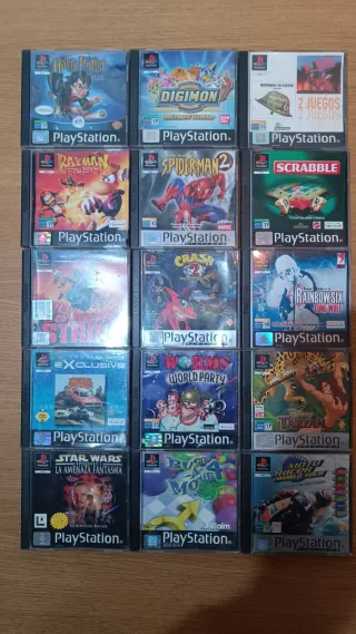 Collezione di 16 videogiochi per PlayStation 1. - Harry Potter e la Pietra Filosofale - Digimon World - War of the Monsters + Worms (2 CD) - Rayman Rush - Spider-Man 2 - Scrabble - Soviet Strike - Crash Bandicoot 2 - Rainbow Six: Lone Wolf - Dukes Hazard Racing For Home - Worms World Party - Disney's Tarzán - Star Wars: Episodio I - La Minaccia Fantasma - Bust-A-Move 4 - Moto Racer World Tour Tutti con libretto di istruzioni tranne Bust-A-Move 4 In buone condizioni usate I 15 giochi per 300€