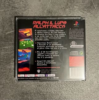 Ralph il lupo all'attacco PS1 Italia _CD originale senza nessun segno o alone e ditate, come nuovo. _Copertine frontale e posteriore nuove, riprodotte su carta fotografica. _Custodia nuova, riprodotta, lucida, senza graffi. _Libretto originale in italiano, qualche piega da lettura. Le foto sono parte integrante della descrizione, riceverete ció che si vede in foto, compreso un altro cd originale del gioco, lucido,come nuovo, ma non funzionante, con un lieve graffio circolare vicino al foro che probabilmente ne compromette la lettura, sulla mia playstation 2 ha funzionato solo una volta, in ogni caso è in omaggio. Grazie