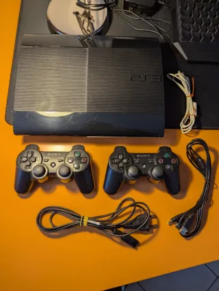 Console Sony PS3 Super Slim in black, complete with two controllers and all necessary cables for connection. - Console - 2 Controllers - Power cable - AV cable - USB charging cable