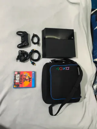 Console PlayStation 4 modello Fat con disco rigido da 1TB. Include il controller DualShock 4 (la batteria non funziona, ma con il cavo va perfettamente), cavi di connessione (HDMI e alimentazione), il gioco Red Dead Redemption 2 e una borsa per il trasporto con logo PlayStation.