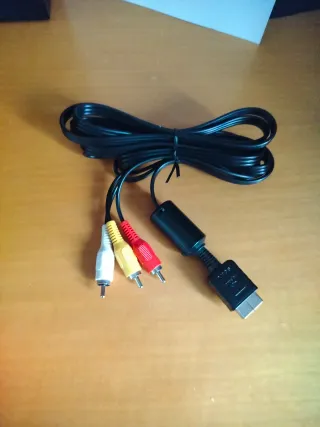 Cavo video originale per PlayStation 2 con sacchetto blu originale. - Connettori RCA (giallo, bianco, rosso). - Connettore proprietario Sony per la console.