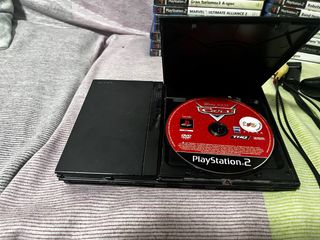 Console PlayStation 2 in colore nero, pronta per ore di divertimento. Include 28 videogiochi. Titoli visibili: Gran Turismo 3 A-spec, Marvel Ultimate Alliance 2, Robots, Band Hero, Cars. Include cavi e controller.