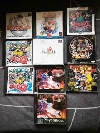 Lotteria di 10 videogiochi giapponesi per PlayStation 1 (PSX). - Final Fantasy VIII dischi lucidati - Tekken 3 dischi lucidati - Tekken 3 Pal Spagna SENZA GIOCO SENZA MANUALE copertina in cattivo stato. - Derby Stallion - Choro Q - Super Robot Wars Alpha - Mahjong Taikai II Special (denti dove si tiene il disco rotti) - Choro Q 2 - Jikkyou Powerful Pro Yakyuu '97 Kaimakuban - Azure Kingdom 4 + New Super Mario Bros Wii (non funziona) Tutti testati e funzionanti.