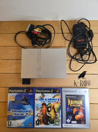 Vendo console Playstation 2 silver, completa di cavi e alimentatore. Inclusi tre giochi. - Console Playstation 2 Slim - Cavo AV - Alimentatore - Snowboard Racer 2 - L'Era Glaciale 3: L'Alba dei Dinosauri - Rayman Revolution (Platinum)