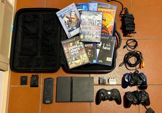 Playstation 2 Slim + 11 Giochi + 4 Controller + Telecomando + Accessori In ottime condizioni perfettamente funzionante Pacchetto comprensivo di: 1 Playstation 2 Slim 2 Controller Playstation originali 1 Controller Logitech Wireless con adattatore 1 Controller Wireless con adattatore (non presente in foto) 1 Telecomando Sony Playstation (DVD) 1 Memory Card 8MB Playstation Tutti i cablaggi originali per connessione presa elettrica e televisione (scart + 3 vie) 1 Borsa con appositi scomparti per il trasporto di tutti gli articoli 11 Giochi originali ed in ottime condizioni (vedi foto)